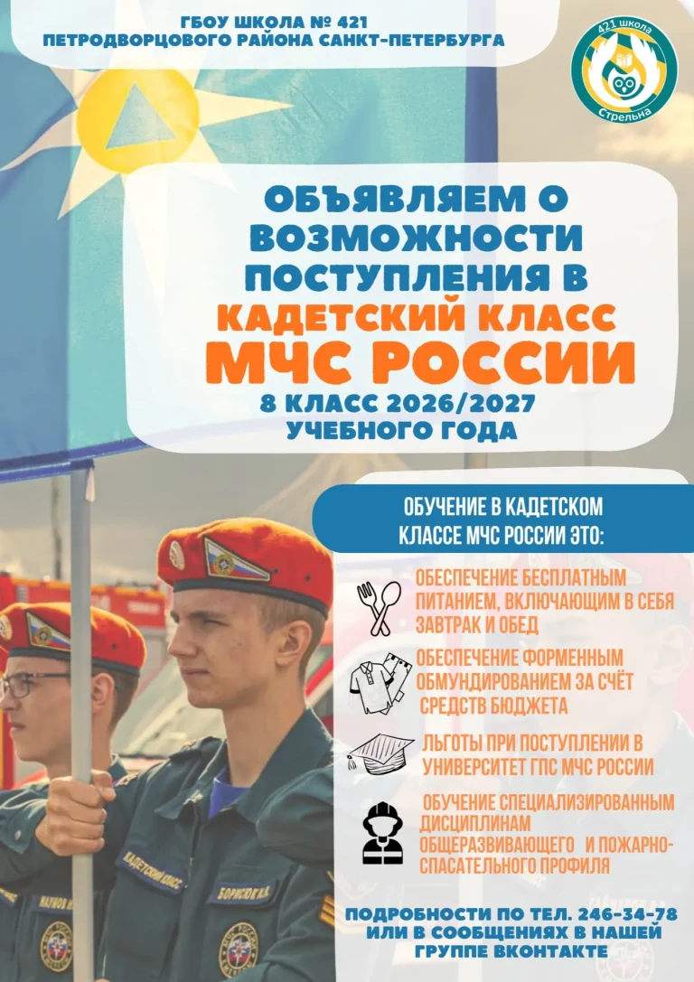 Дорогие дети и уважаемые родители! Школа №421 объявляет о возможности поступления в кадетский класс МЧС России на учебный год 2026/2027....